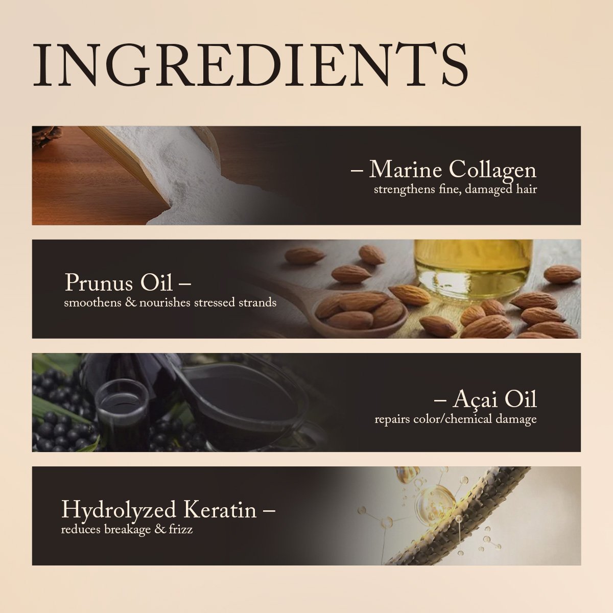 Aqua, Cetearyl Alcohol, Cetyl Alcohol, Cetearath-20, Phenoxyethanol, Shea Butter, Hydrolyzed Keratin, Ultramarines, Acacia Senegal Gum, Titanium Dioxide, Mica, Helianthus Annuus Seed Oil, Marine Collagen, Prunus Oil, Açai Oil, Guarana Oil, Citric Acid, Disodium EDTA, Glycerin, Benzyl Salicylate, Limonene, Linalool, Fragrance.